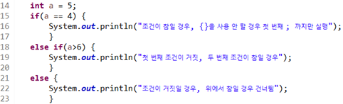 if(조건){true} //조건이 참일 경우, {}을 사용 안 할 경우 첫 번째 ; 까지만 실행