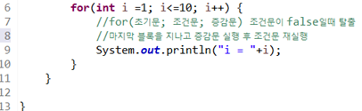 // 블록내 마지막 라인을 지나고 증감문 실행 후 조건문 재실행
