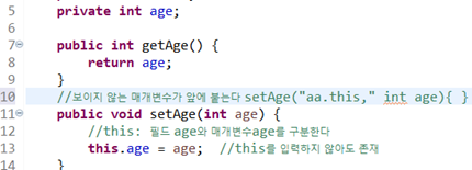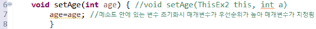 -메소드 안에서 필드와 매개변수의 이름이 같을 경우 지역 변수가 우선순위가 높기 때문에 매개변수가 지정됨