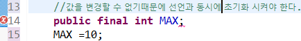 -값을 변경할 수 없기 때문에 선언과 동시에 초기화 시켜야 한다.